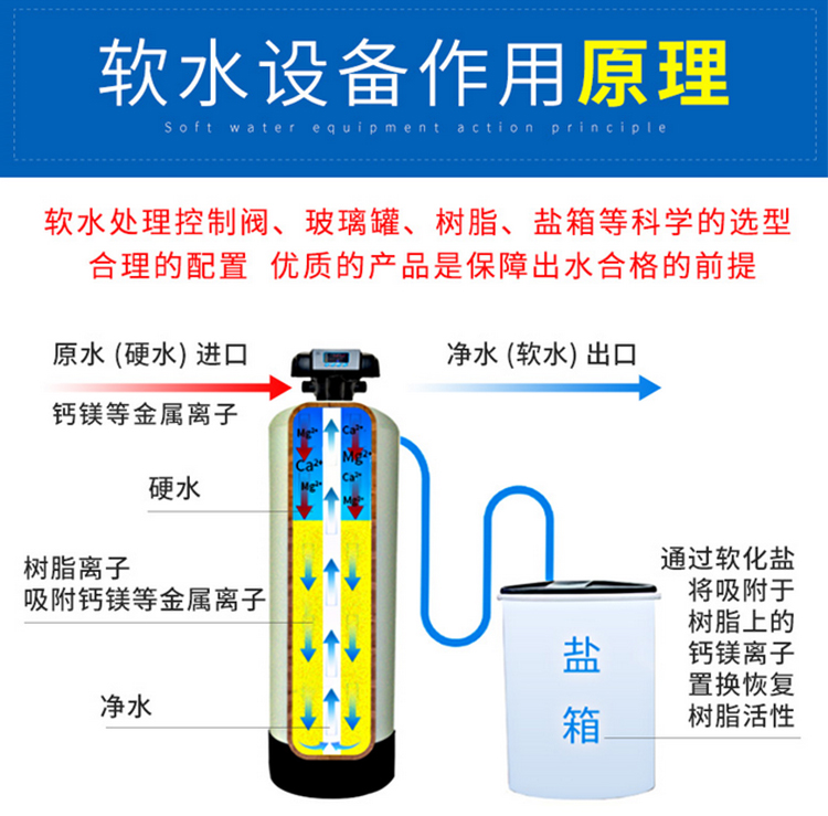 以市政自来水为进水,通过树脂中的Na+ 置换水中的Ca2+、Mg2+ 等金属离子,并吸附到树脂上,从而使水得到软化的装置。饱和后的树脂在水处理自动控制器控制下用浓盐水再生,可恢复交换能力,循环使用。